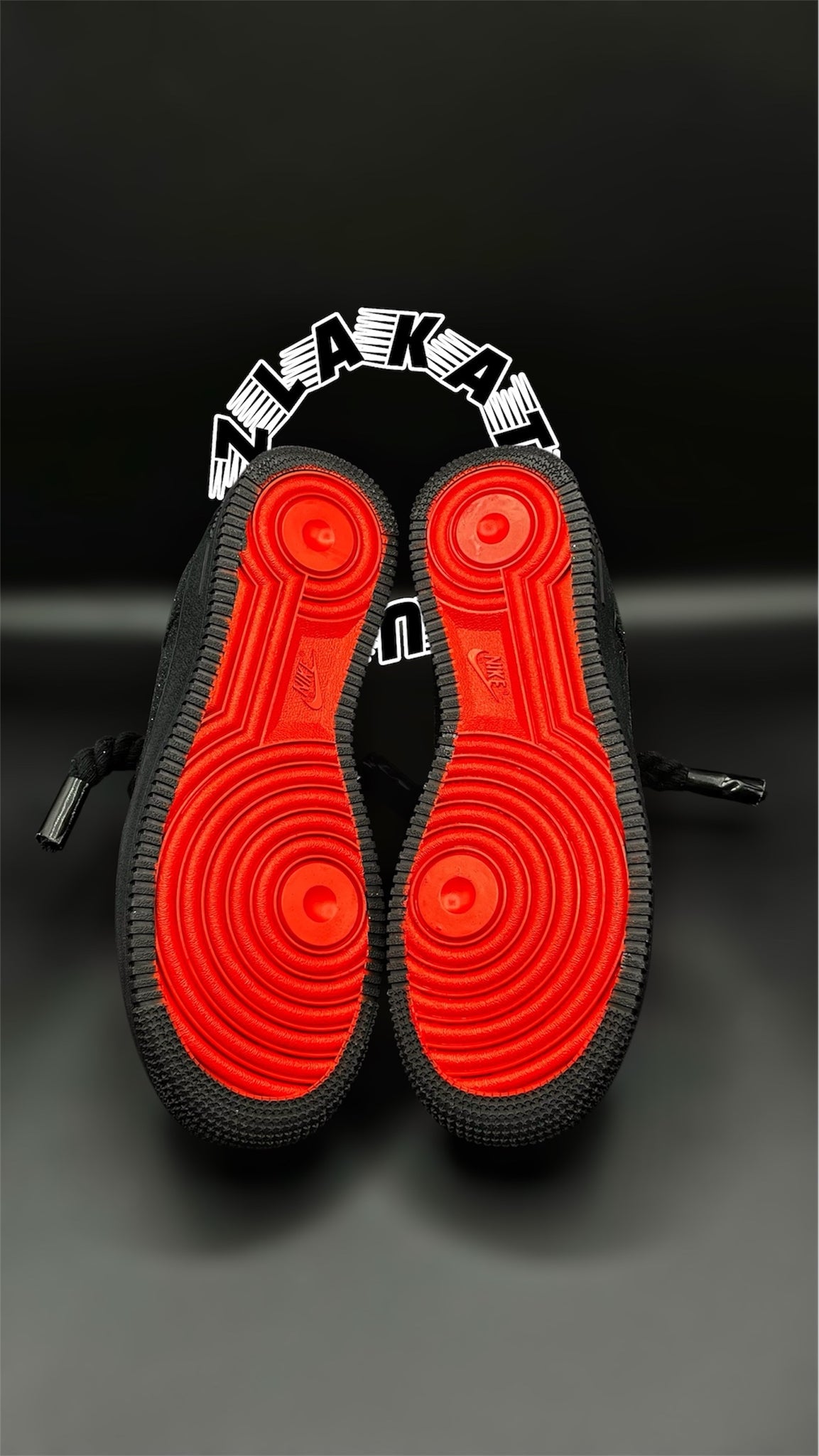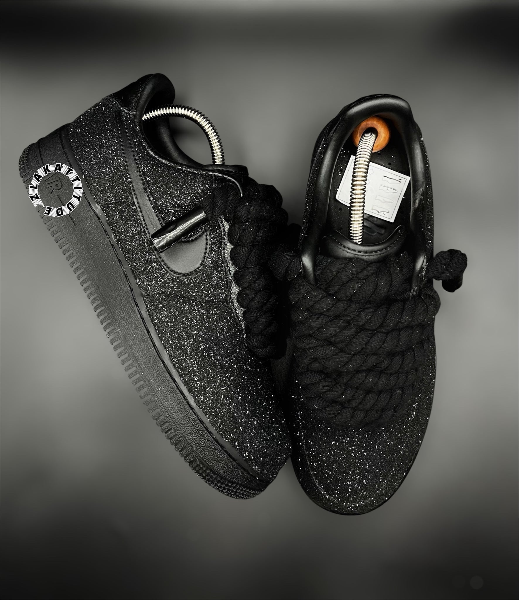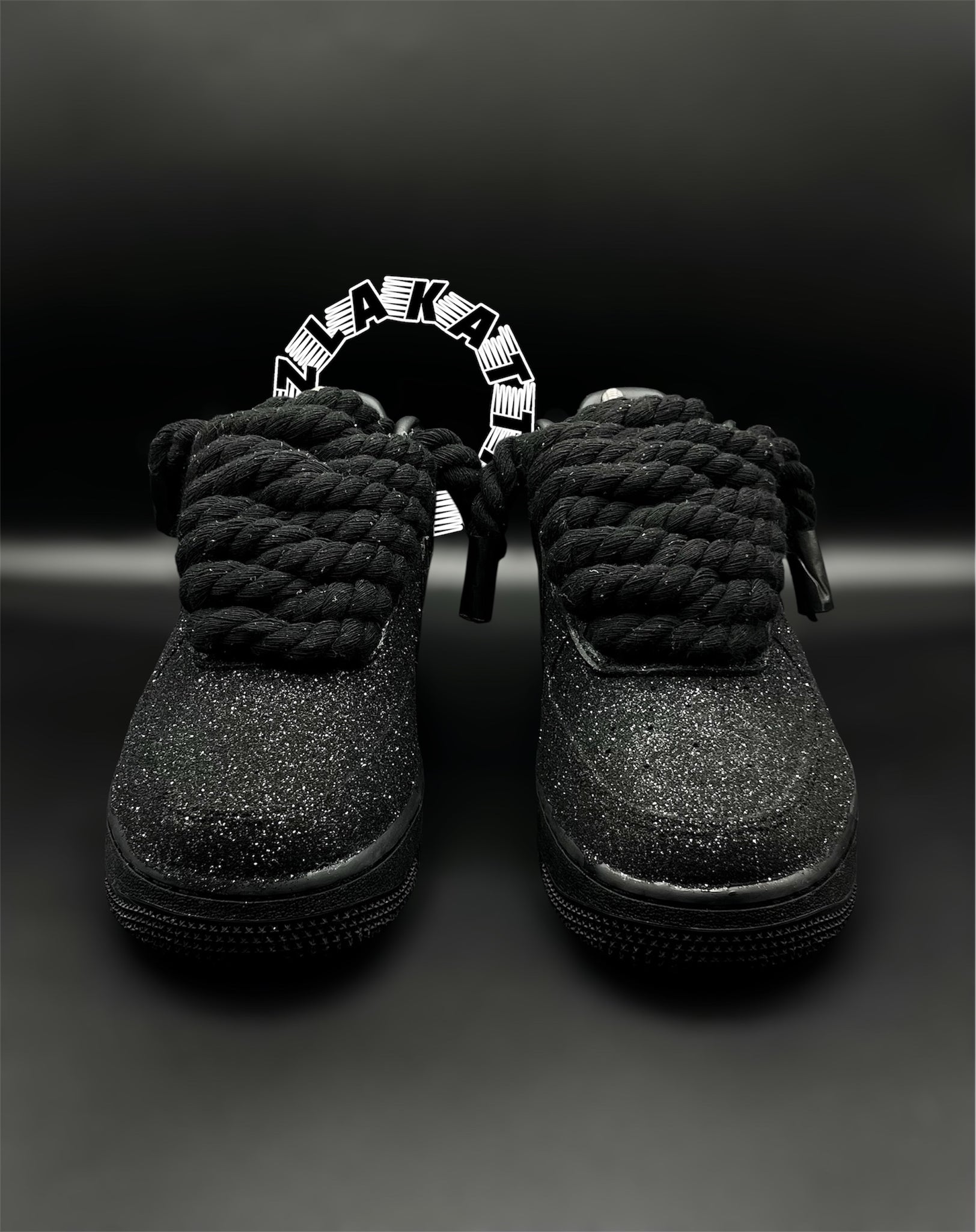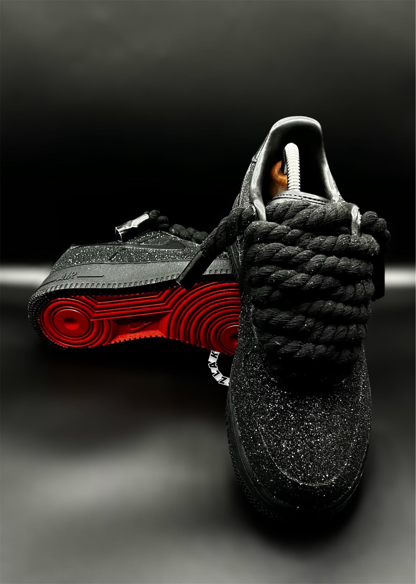 Sneakers AF1 custom noires avec semelle rouge et finition pailletée. Design unique fait main. Précommande exclusive disponible maintenant.