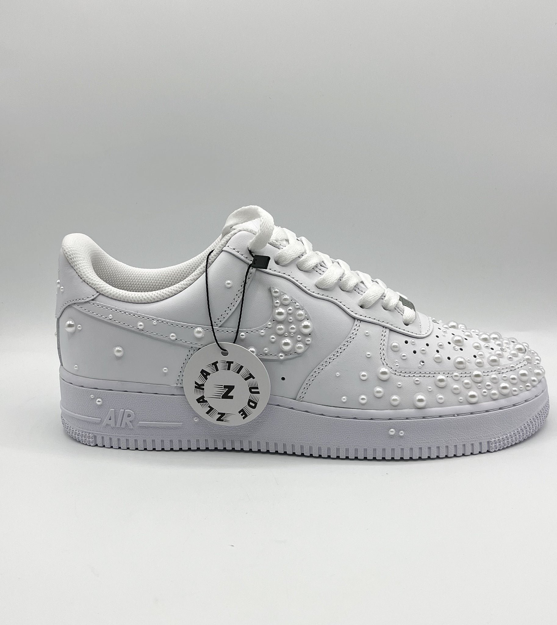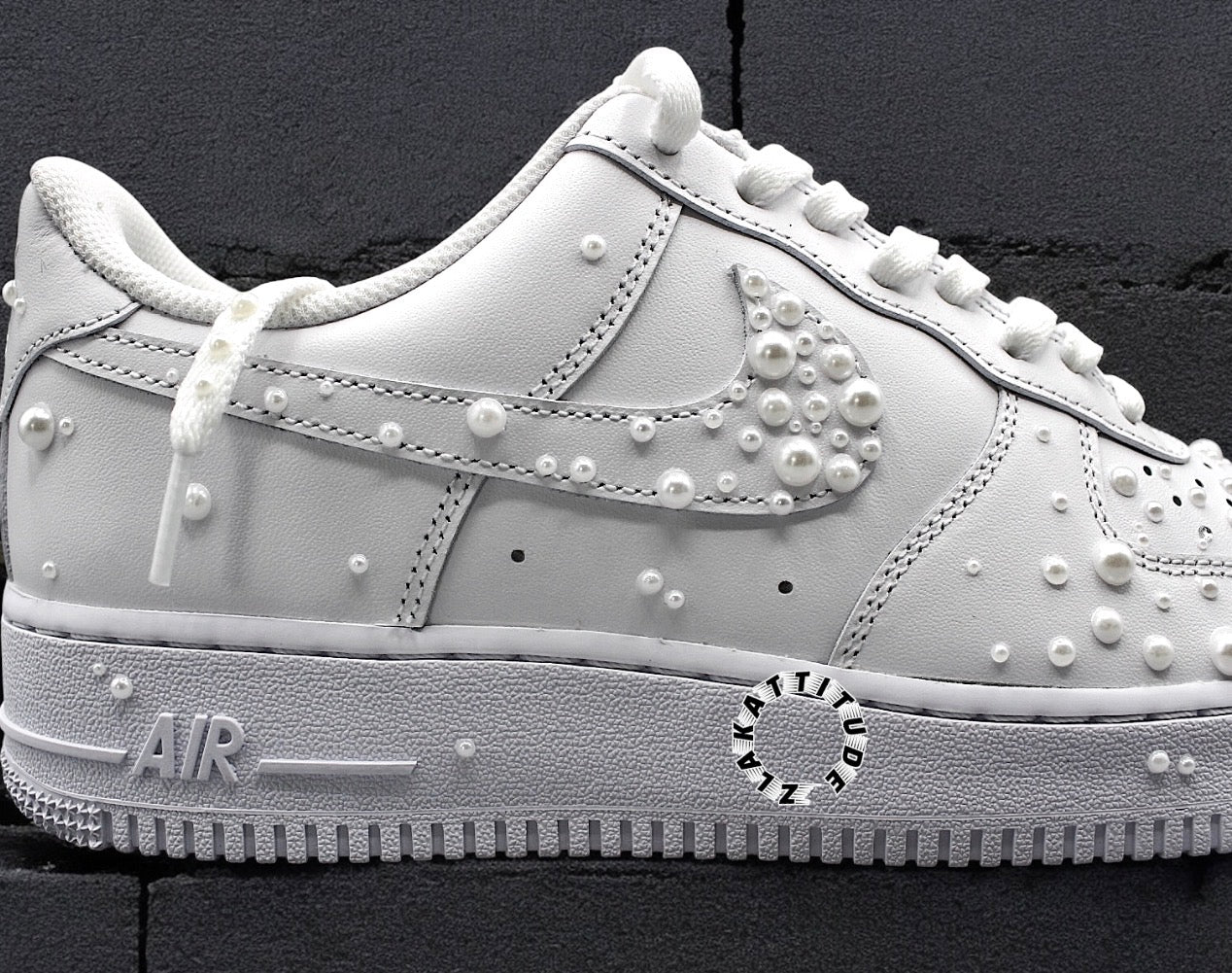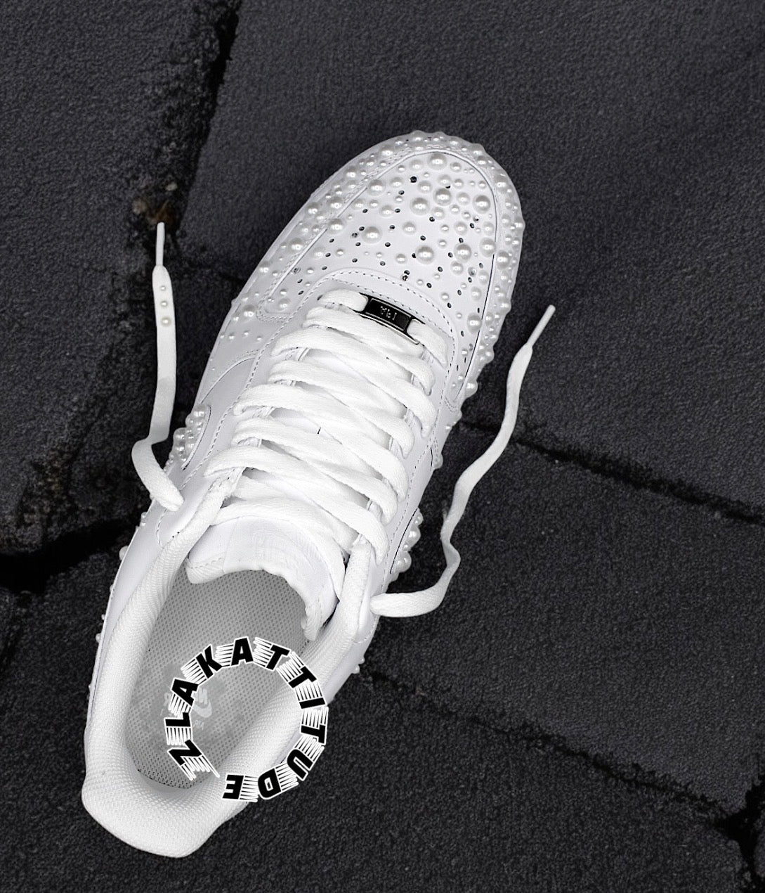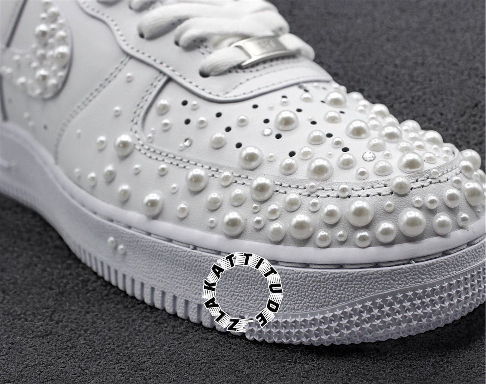 Découvrez la Custom Nike Air Force 1 « Perles Blanches », une version revisitée du modèle iconique qui allie luxe et créativité.