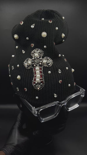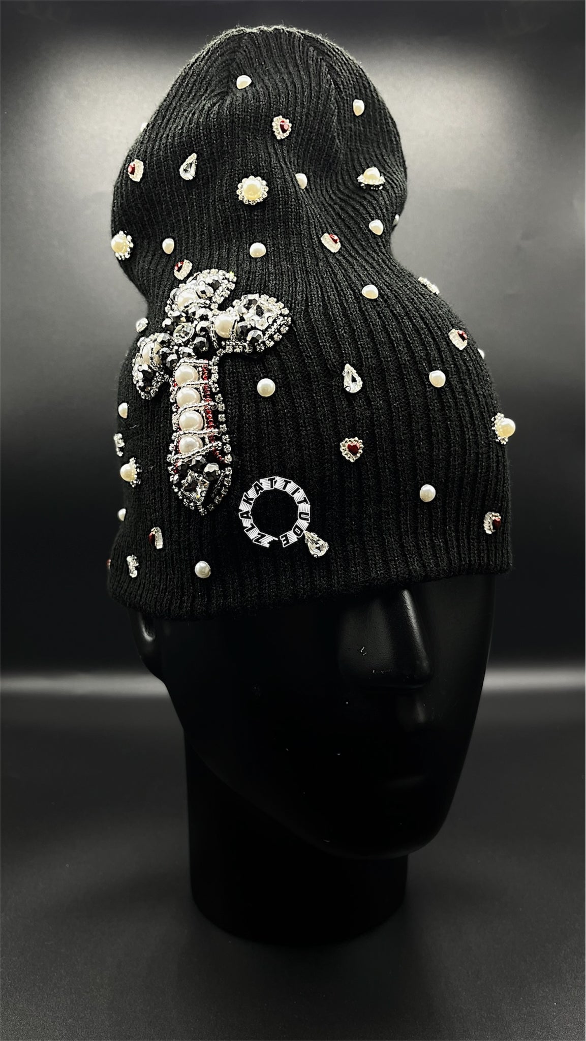 Confectionné à la main, ce bonnet en maille polyester premium est orné de perles et strass minutieusement posés pour un rendu ultra-raffiné.
